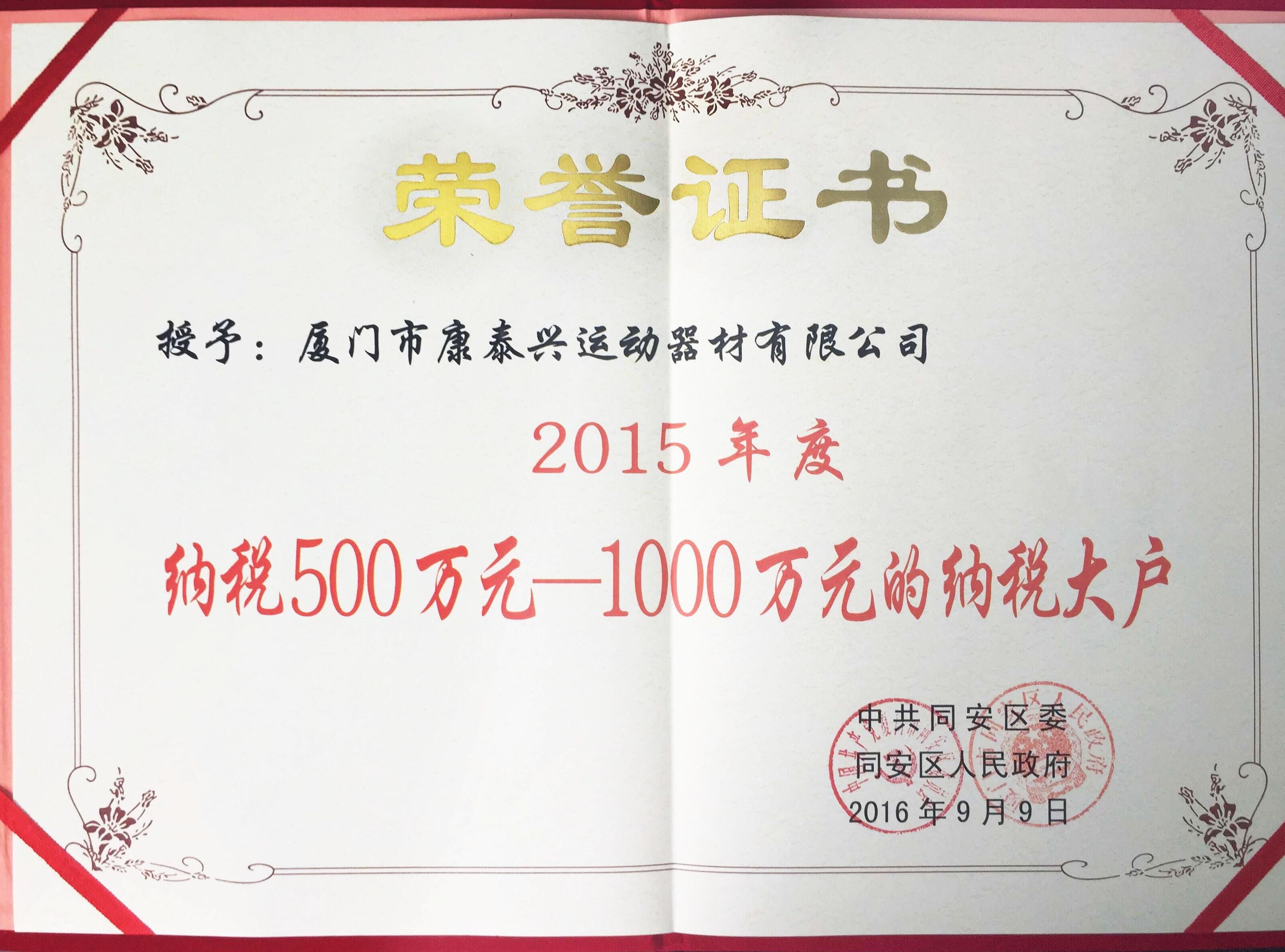 近日,經中共同安區委同安區人民政府批準,廈門市康泰興運動器材有限公司(以下簡稱“公司”)授予2015年度納稅500萬——1000萬元的納稅大戶“”公司憑借長期積累沉淀的強勁實力和始終如一的卓越服務,再次得到行業與社會的認可,專注、專業的形象深入人心。